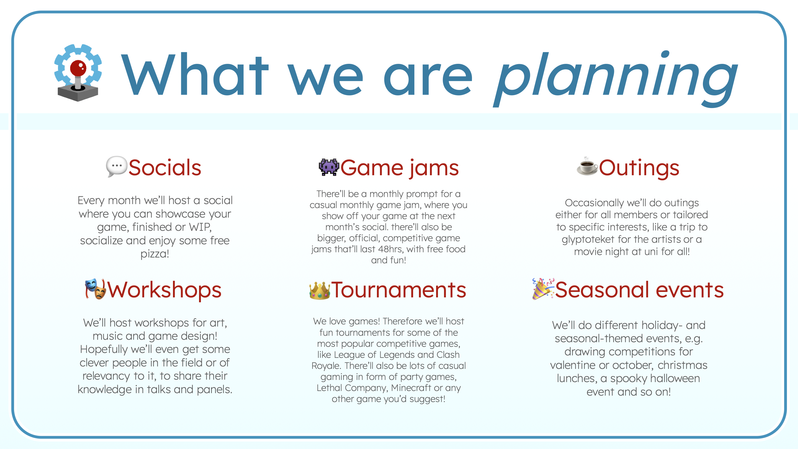Joining the club is non-committal. As a student you're most likely busy, so while we'd of course love for you to actively participate, you can show up to as much or as little as you want. As a member, you'll gain access to all our events, but there's no pressure to take part in everything.